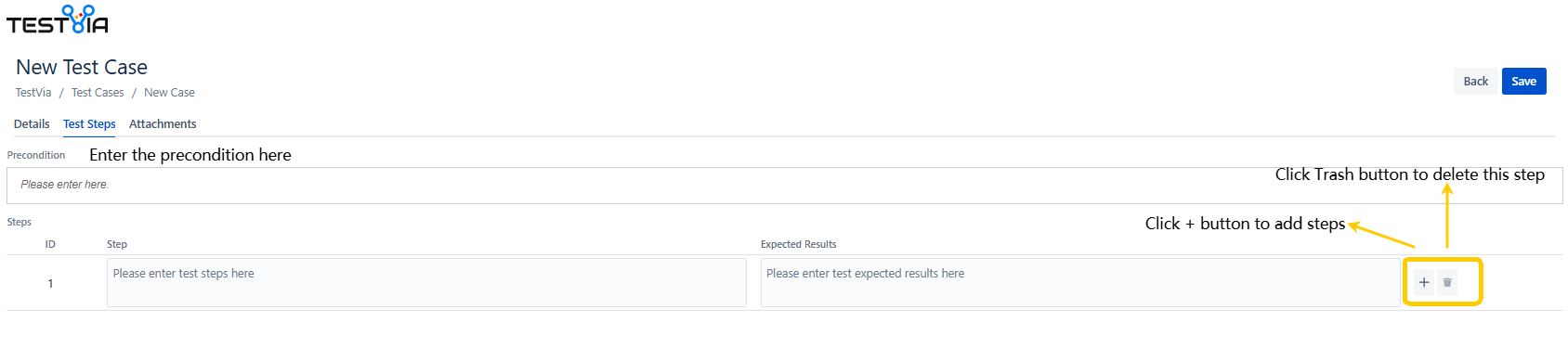 In this page, the users are able to enter the preconditions, test steps and expected results.