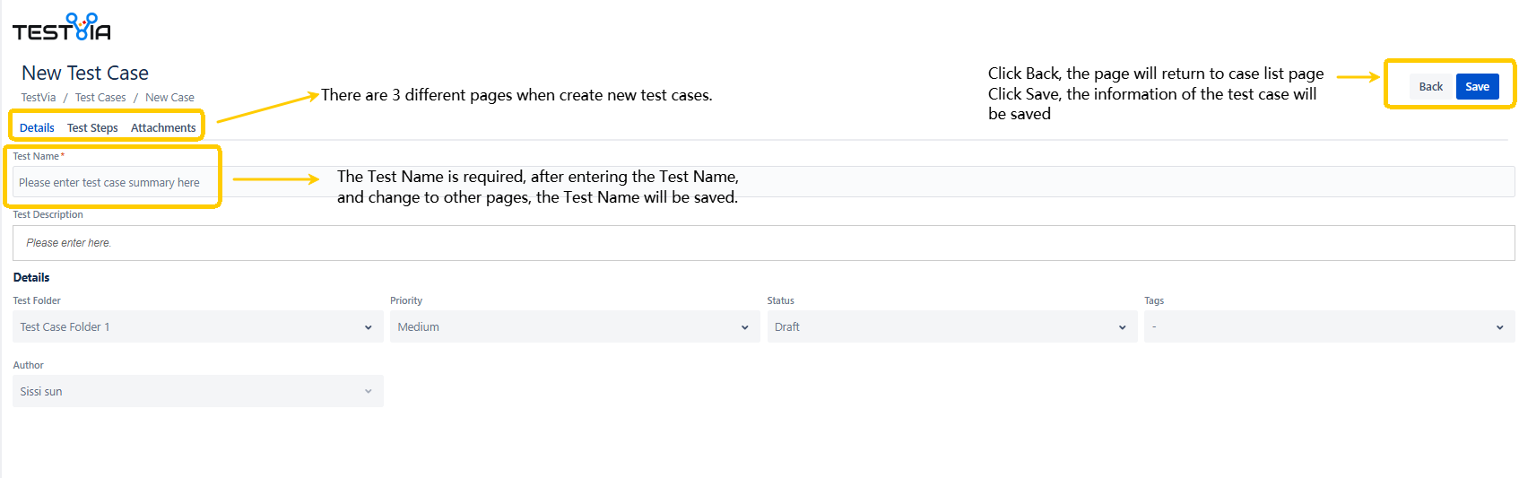 Click the Back button, the case is not created and the page back to the Test Case page.