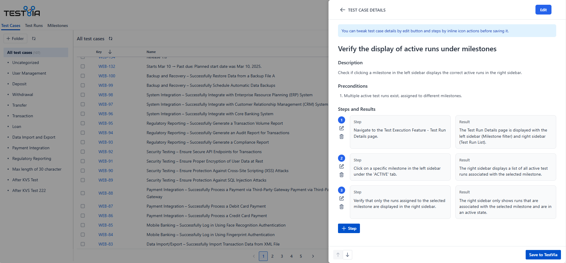1. Click Save to TestVia button to add test case after editing.