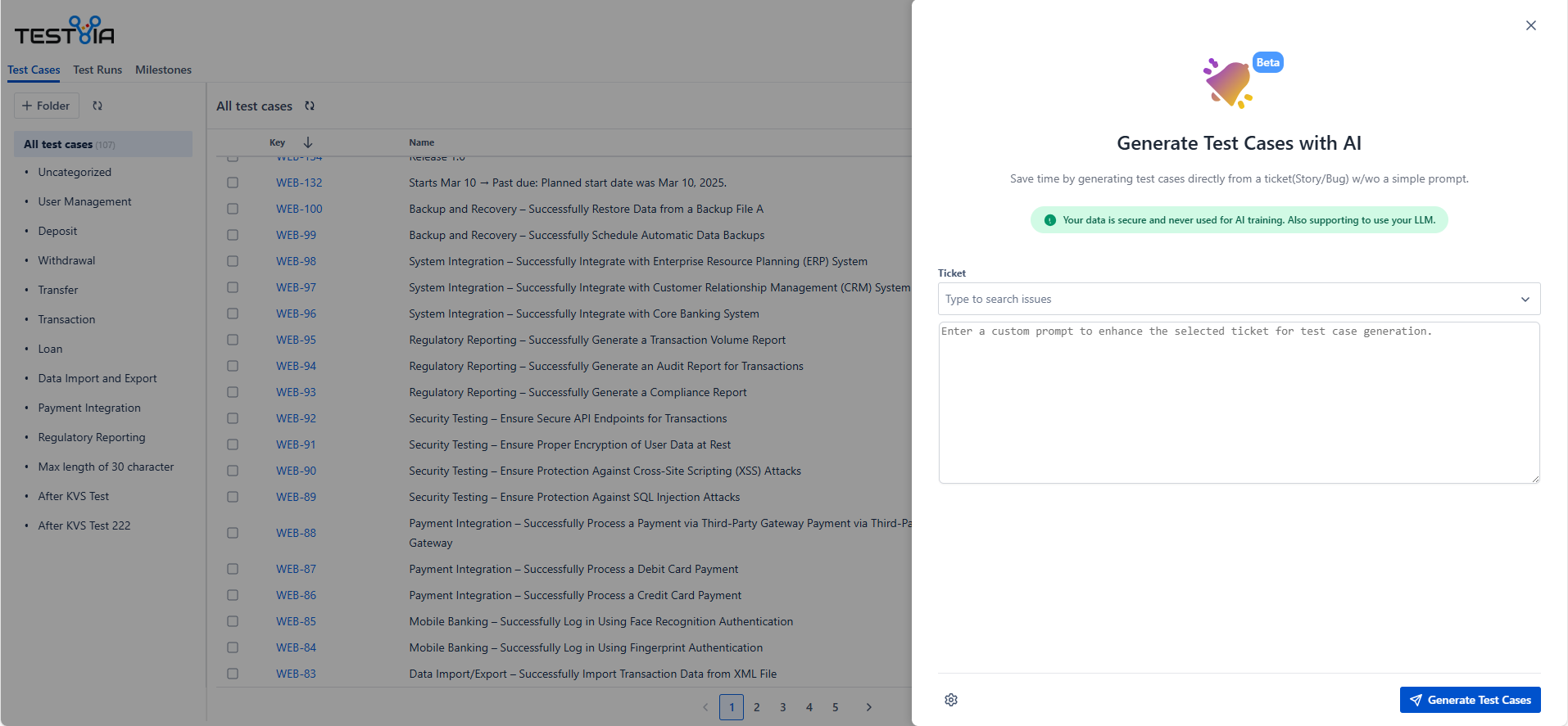You can now automatically generate test cases using AI based on ticket descriptions or custom prompts.