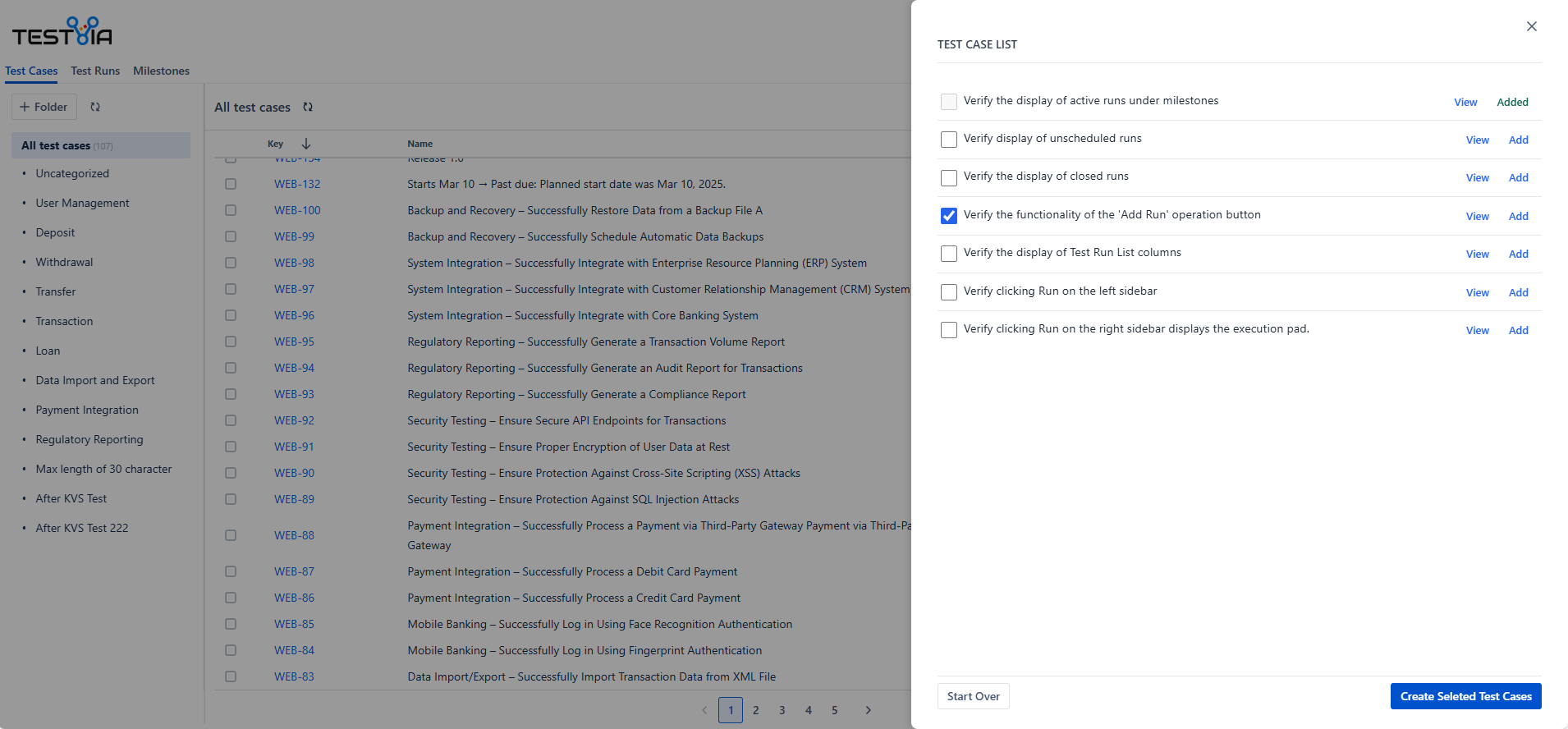 1. Able to add one by one or select multi test cases to add to TestVia.