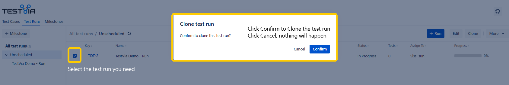 With the Clone button on the page, the users are able to clone the Test Run. There are 2 pages to clone the runs.