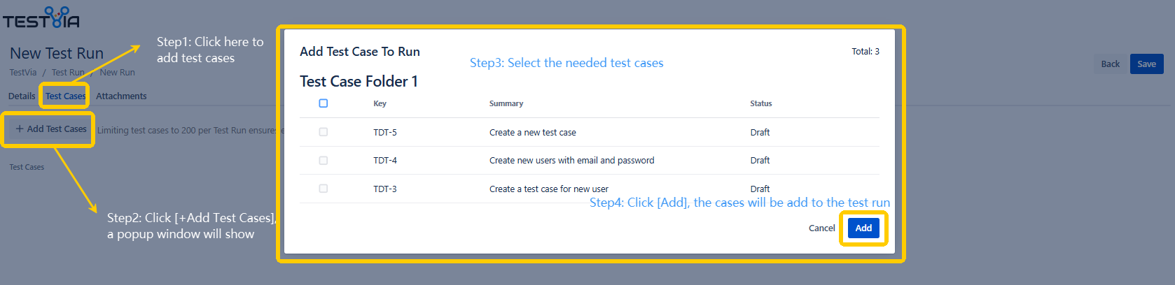 1. Click the Test Case, add the needed test cases in the run.