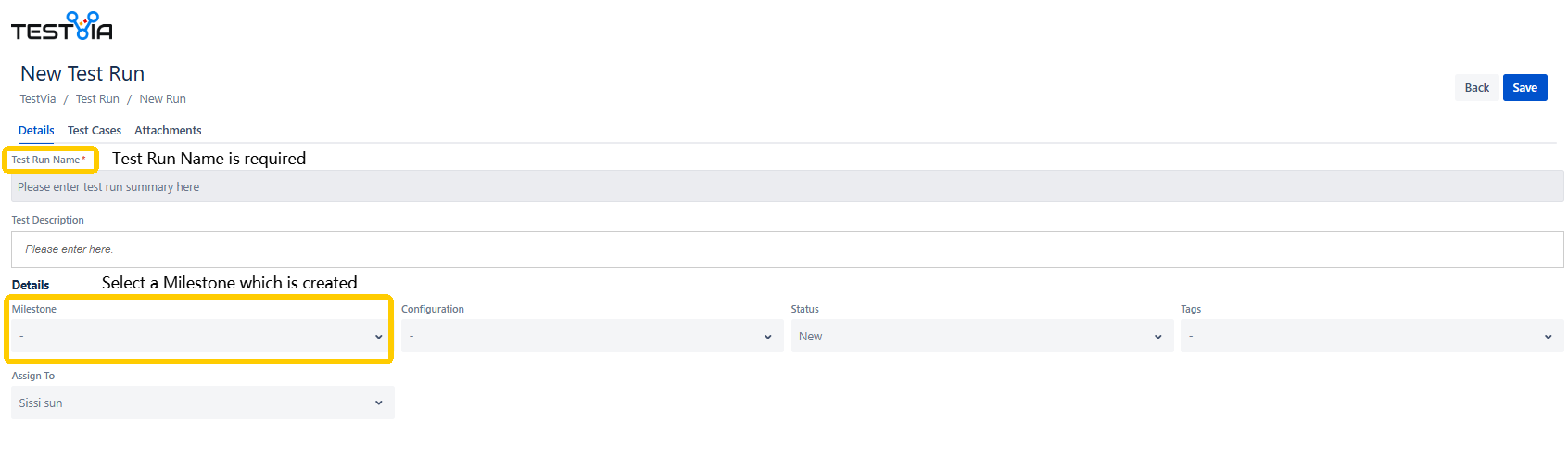 2. Enter the required field. Please notice, there is a Milestone dropdown menu, the created milestones should show in the list. Please select one and the test runs should be under the milestone.